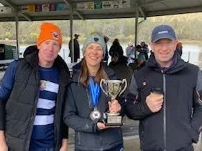 It was cold, wet and windy on the Goulburn River pondage in Eildon, but that didn’t stop Mel Watts, Simon Watts and Steve Gaspars from putting in some great performances, with Mel taking out a win and a cup in the Female Masters Single Scull. Congratulations to our three brave HRC scullers! Thank you to Steve for towing the trailer along all those scenic and difficult roads to Lake Eildon.