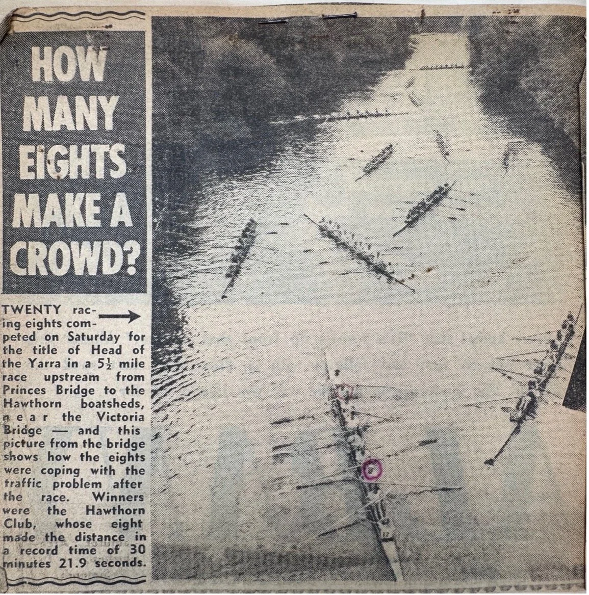 And what does that tell us? With “only 20” entrants in 1960, there was a “traffic problem” on the river at the finish! Oh and a Hawthorn crew won in 30 minutes21.9 seconds.